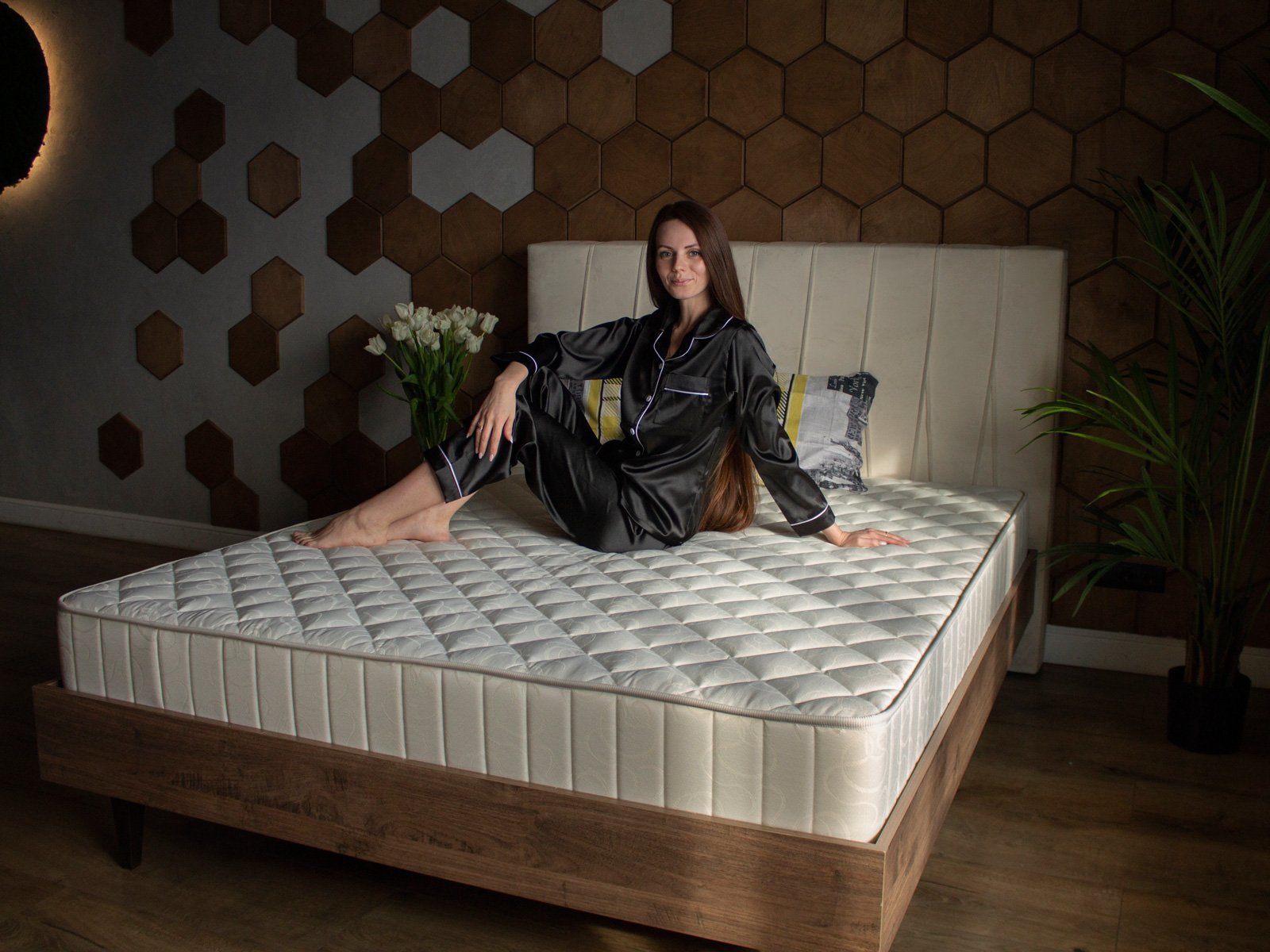 Внутри установлены две плиты искусственного латекса по 4 см каждая, а между ними скрывается крепкий пружинный блок TFK. Такая структура не случайна: независимые пружины дают матрасу ортопедические качества, он оказывает видимую поддержку для спины.
