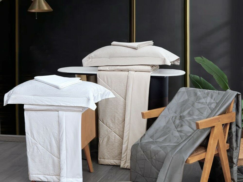 Комплект из одеяла ("одеяло-комфортер" - используется вместо пододеяльника), простыни и наволочек из хлопкового жаккарда.