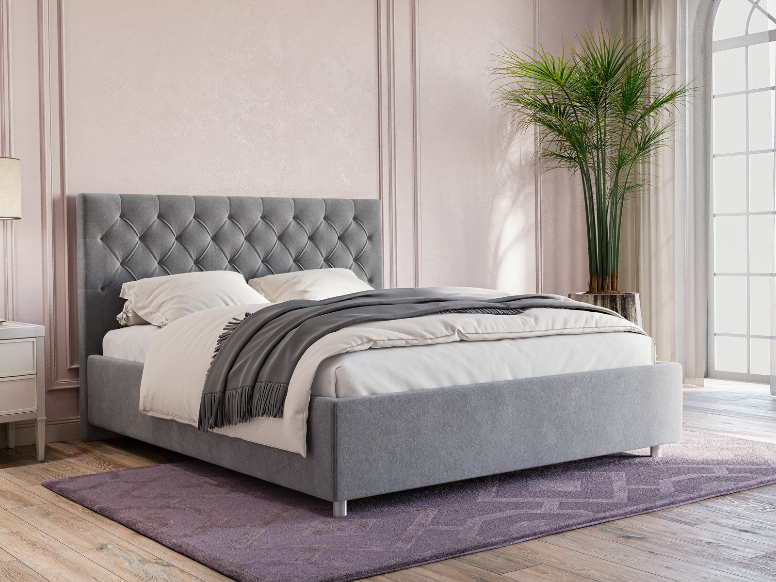Продуманный дизайн спинки украсит минималистичный и классический интерьер. Классическая каретная стяжка на изголовье привлекает внимание и делает её невероятно эстетичной и изысканной.
