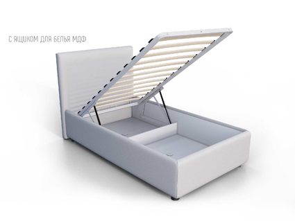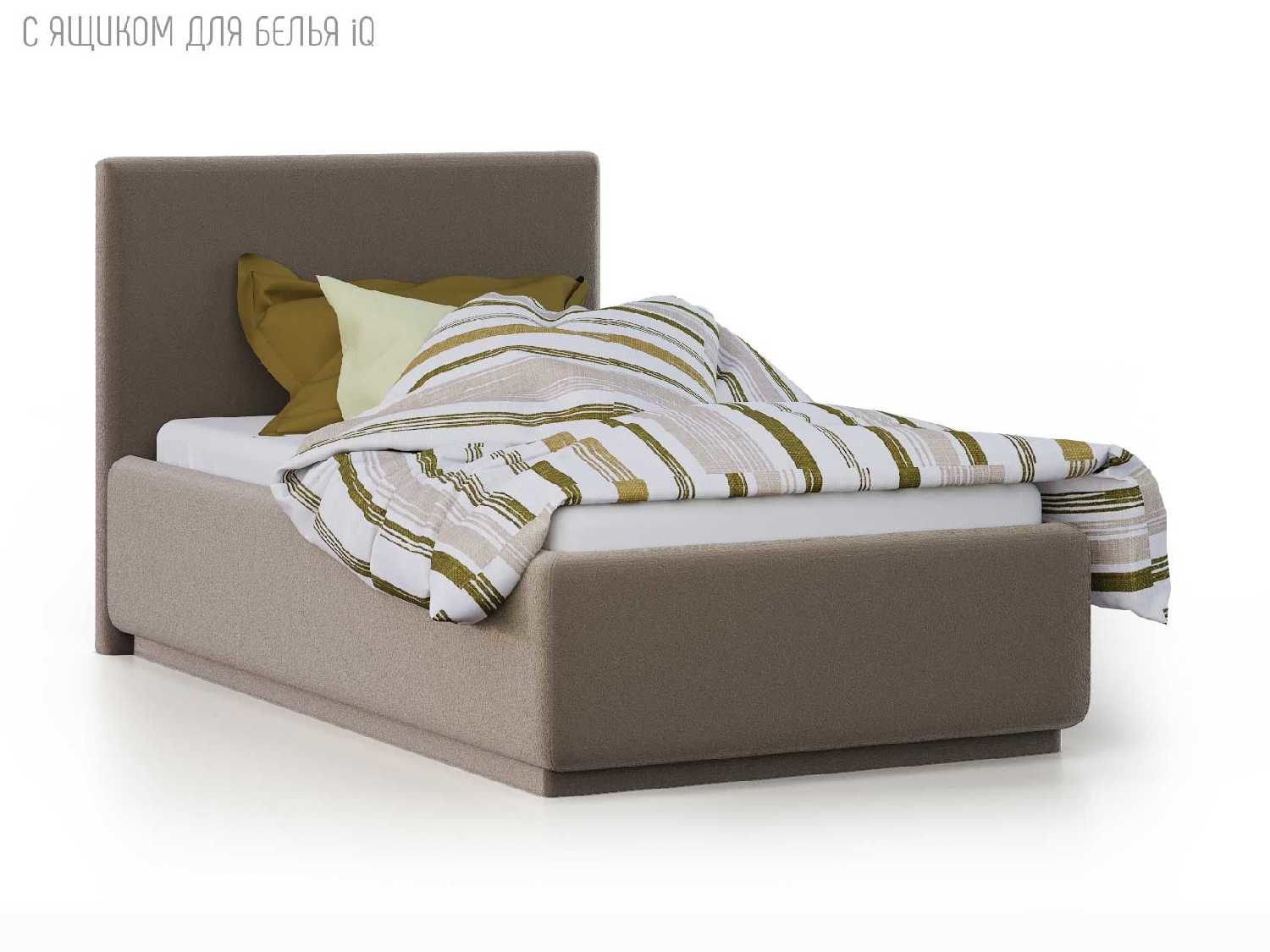 Кровать укомплектована IQ с подъемным механизмом и ящиком для белья без дна (дополнительная платная опция - дно к ящику IQ из HDF (ХДФ). Каркас кровати на цоколе, декоративный чехол на цоколе съёмный. Глубина ящика для белья - 30 см, без ограничения нагрузки на ящик.