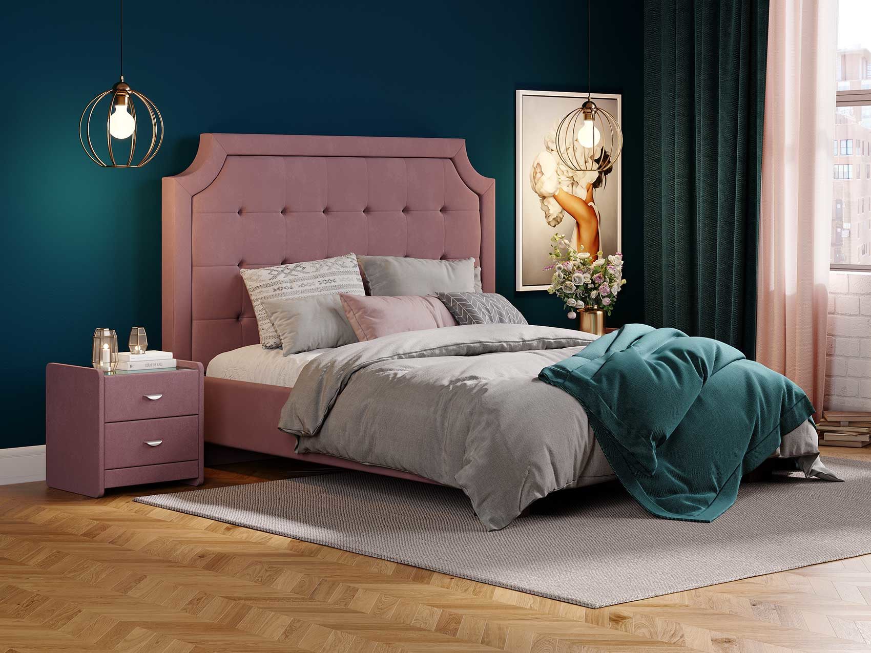 Кровать прекрасно впишется в интерьер от классики до современного стиля и cтанет отличным решением для просторной светлой спальни. Высокая спинка с мягкими утяжками и массивной рамкой выглядит эффектно. Задняя часть спинки кровати выполнена в основной ткани, благодаря этому ее можно установить в центре комнаты. Увеличенная прочность кровати достигается за счет металлического каркаса по периметру. Массивные ножки, выполнены из бука цвета венге. Расстояние от пола до царг способствует легкой уборке под кроватью, в том числе роботом – пылесосом.