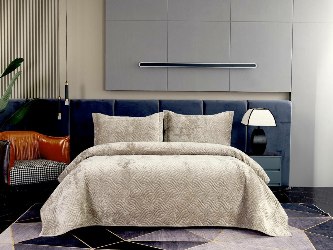 Покрывала «Деварта»: нежность и уют в вашем доме Окунитесь в мир комфорта и изысканности с новой коллекцией мягких бархатных покрывал «Деварта». Эти изделия станут настоящим украшением вашей спальни, добавив ей уюта и элегантности. Покрывала изготовлены из высококачественного бархата, который приятен на ощупь и обладает нежной бархатистой текстурой. Они устойчивы к износу и надолго сохраняют свой привлекательный внешний вид, яркость цвета и мягкость. Благодаря прочной и качественной декоративной стёжке «косичка» наполнитель надёжно зафиксирован внутри изделия. «Деварта» представлена в пяти оттенках: от тёплого бежевого до спокойного серо-голубого. Вы сможете подобрать идеальный вариант для вашего интерьера. Размерный ряд включает два варианта, что позволяет выбрать покрывало, которое идеально подойдёт для вашей кровати или дивана. В комплект входят две наволочки размером 50х70 см. Каждое покрывало аккуратно обшито кантом, а наволочки украшены милыми ушками шириной 5 см. Это придаёт изделиям особый шарм и делает их ещё более привлекательными. Не упустите возможность приобрести эти замечательные покрывала и создать в своём доме атмосферу тепла и уюта. «Деварта» подарит вам не только эстетическое наслаждение, но и незабываемые ощущения при каждом прикосновении.