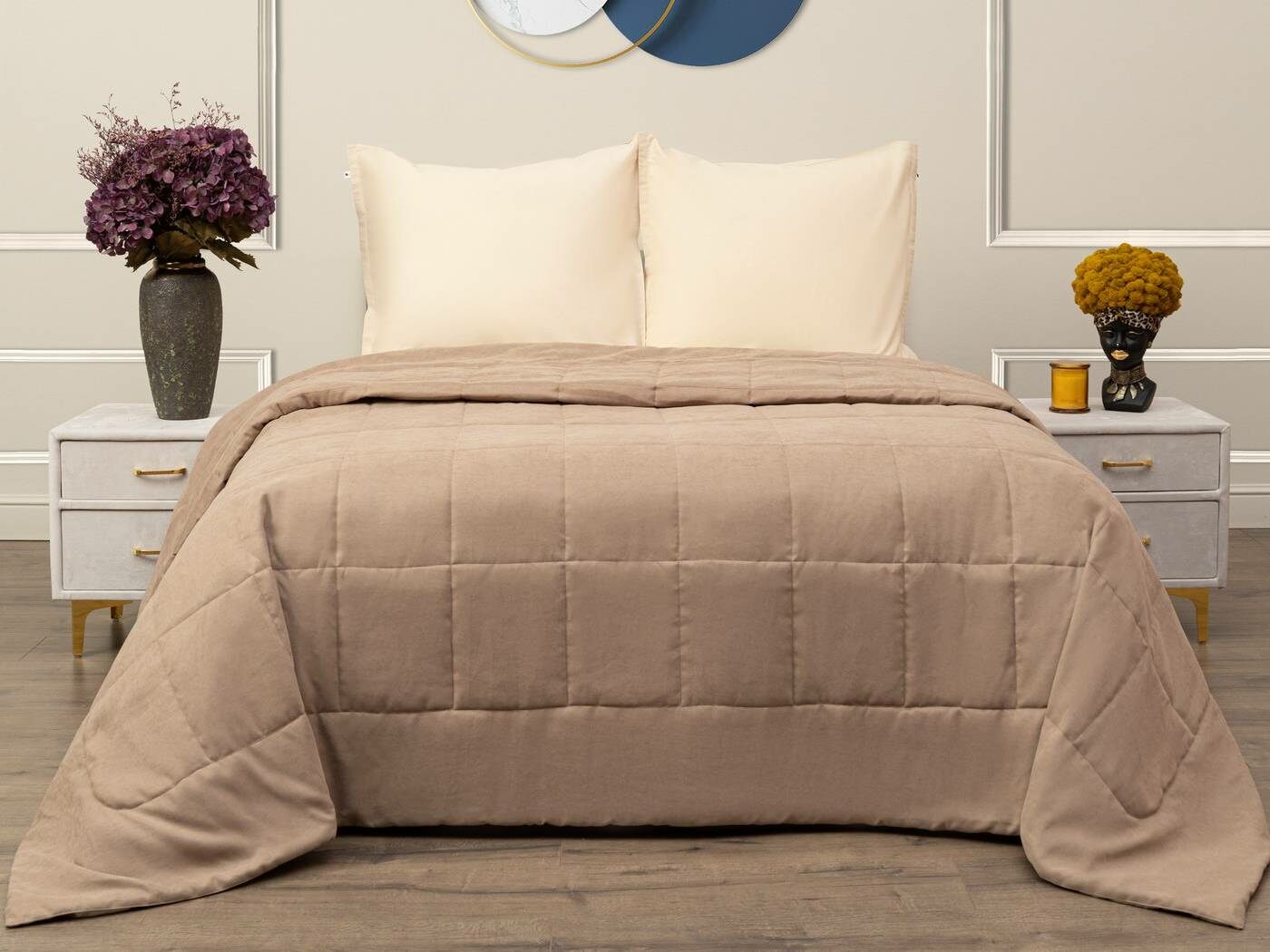 Ткань верха – бархатистый канвас. Канвас отлично себя зарекомендовал как износостойкий и плотный материал обеспечивающий мягкий противоскользящий эффект. Покрывала имеют классическую для канваса машинную стежку «квадрат». Плотная и мягкая фактура ткани канвас не оставляет зацепок, изнаночная сторона выполнена из матового и нежного тика. Такое покрывало украсит собою спальную или гостиную комнату, органично подчеркнет Ваш утонченный стиль.